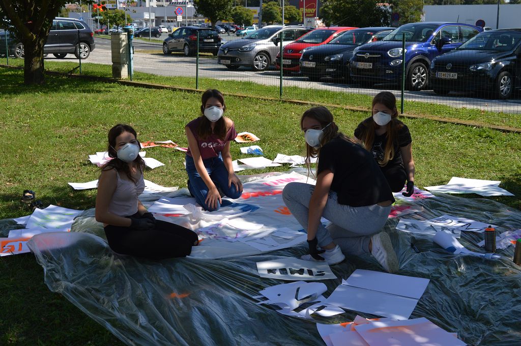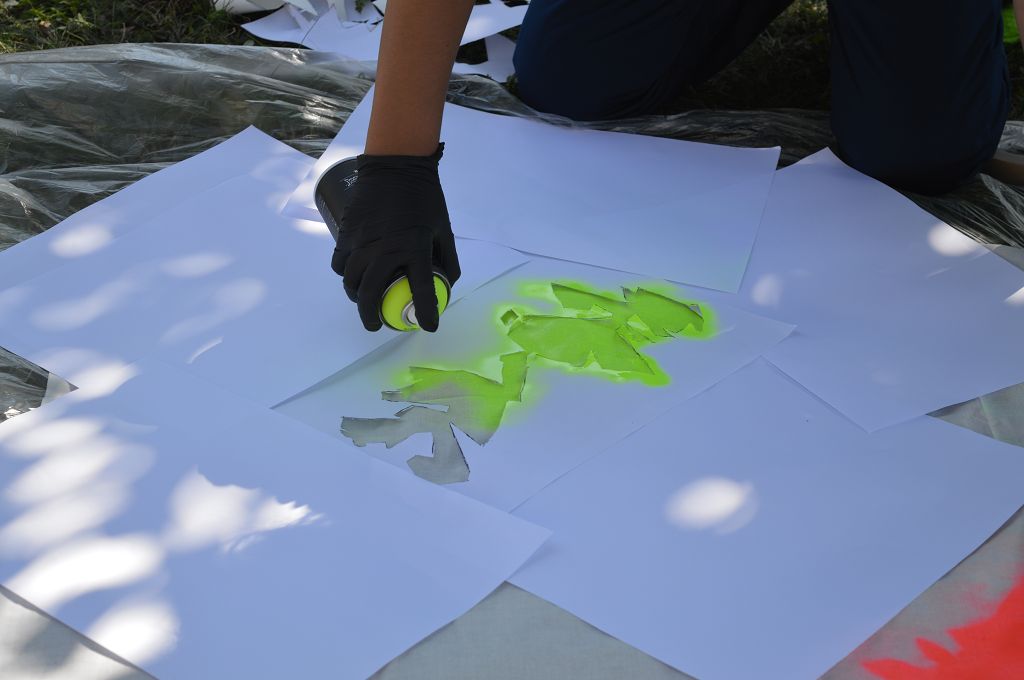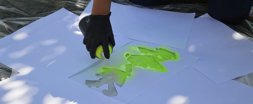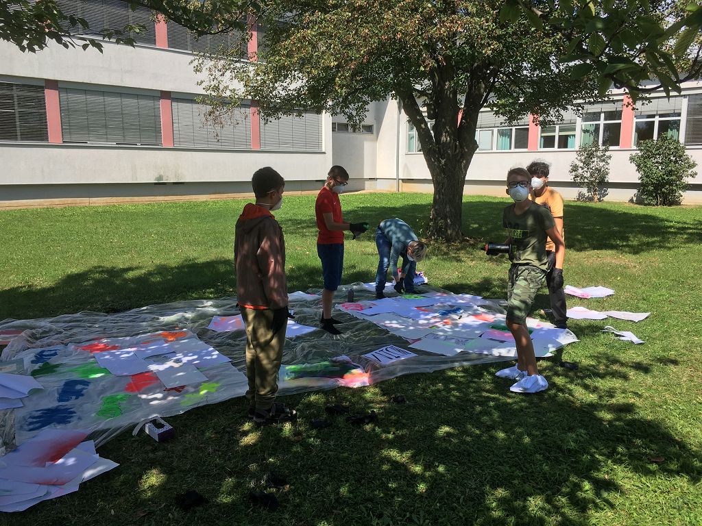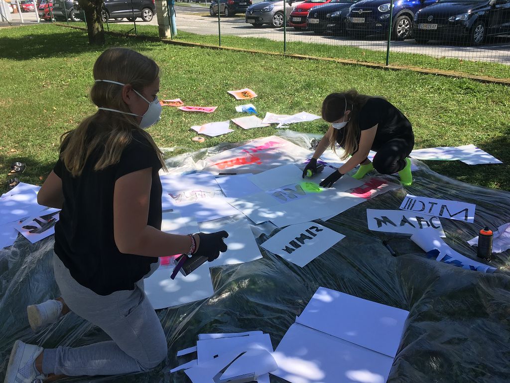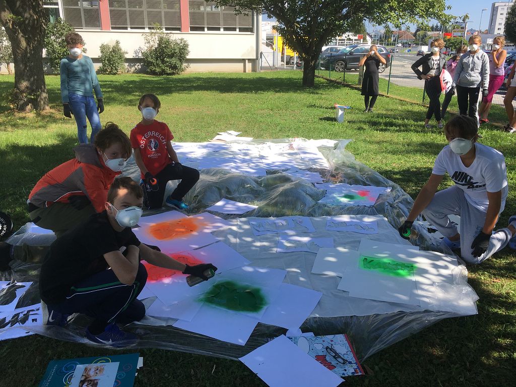 Sie lernten verschiedene Arten von Graffiti-Schriftzügen sowie Zeichentechniken kennen. Der krönende Abschluss des Projektes fand am 10. September 2018 im Pausenhof der NMS statt. Die Kinder durften, ausgerüstet mit einer Atemschutzmaske und Handschuhen, ihre vorgefertigten Graffiti-Namen mit Spraydosen auf ein Leintuch sprayen. Obwohl es für alle die erste Sprayer-Erfahrung war, hatten alle Schülerinnen udn Schüler einen riesen Spaß.