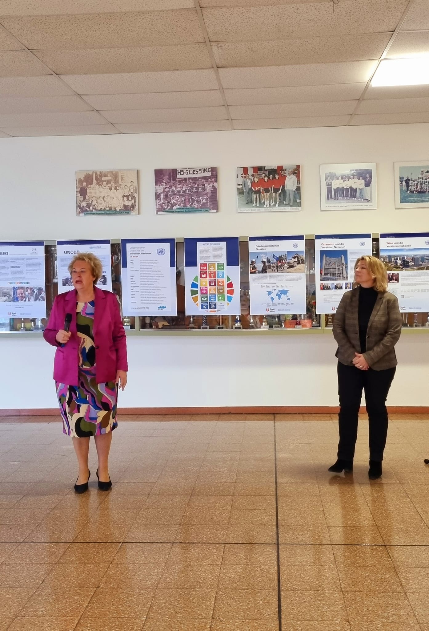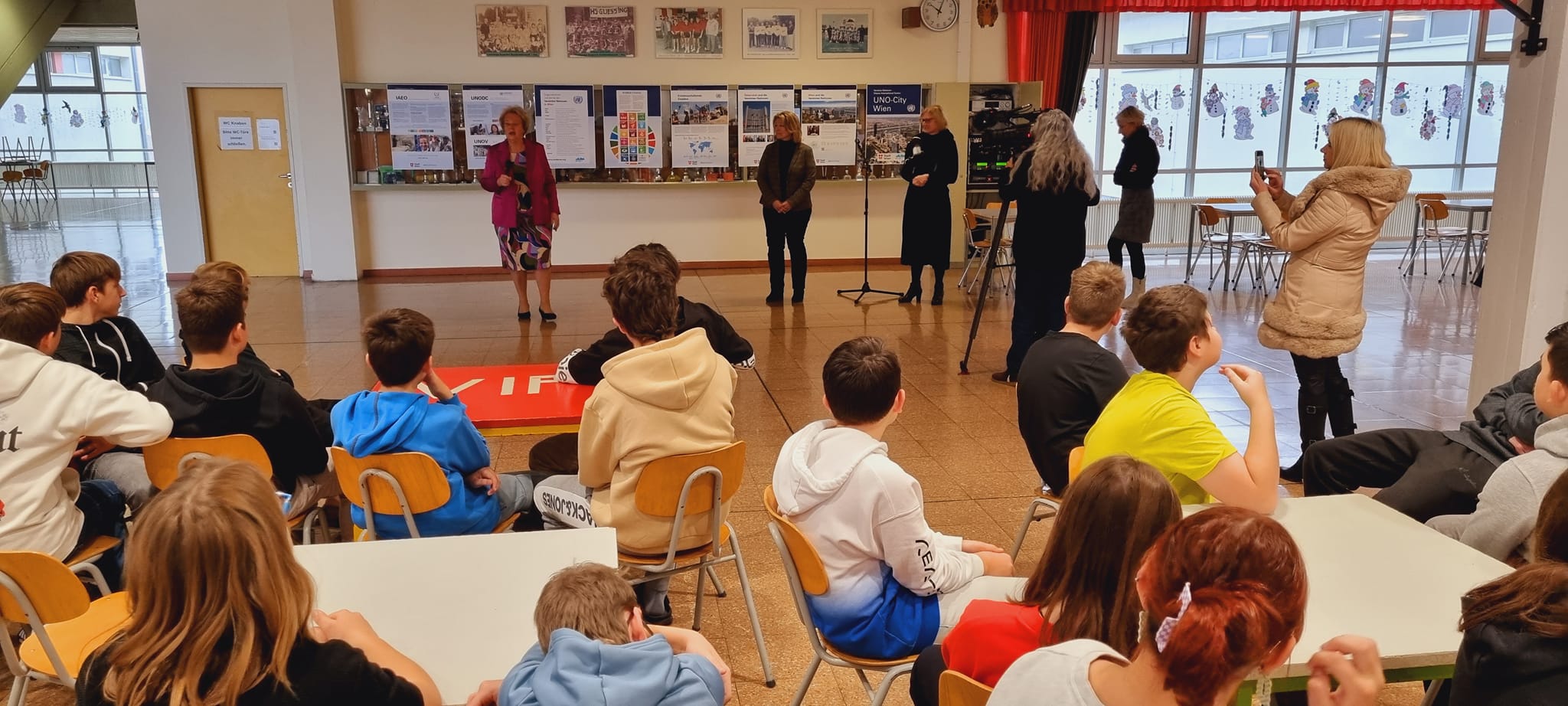 Seit 2.12.2022 informiert die Wanderausstellung „UNO City“ über die Bedeutung der Vereinten Nationen. Die Ausstellungseröffnung nahmen Landtagspräsidentin Verena Dunst, SQM Martina Bugnits und Schuldirektorin Martina Farkas vor.
