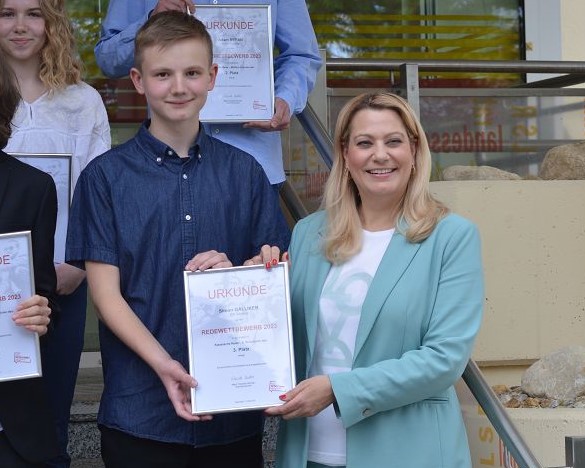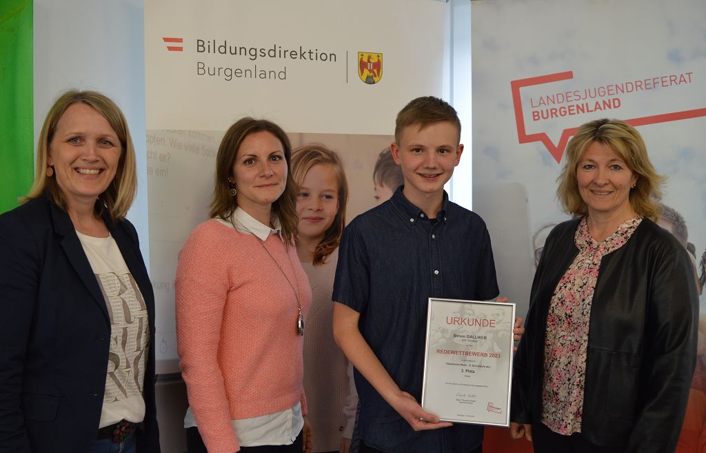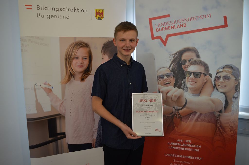 Simon Galliker, Schüler der 4b Klasse, erreichte in der Kategorie "Klassische Rede" beim Landes-Jugend-Redewettbewerb den tollen 3. Platz. Am 15. Mai 2023 fand in der Bildungsdirektion in Eisenstadt die Preisverleihung statt.