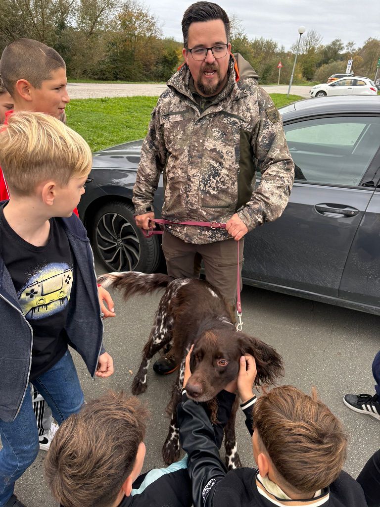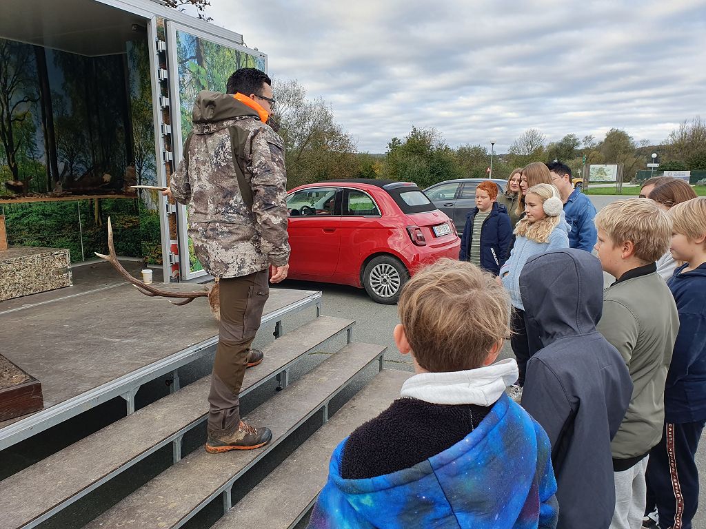 Unter der Leitung der Waldpädagogen Alexandra Laky und Michael Mayer konnten die Kinder der 2. Klassen am 14.10.2024 einen spannenden Workshop erleben. Im Anhänger der "Werkstatt Natur" gab es viel zu erklären und anzugreifen. Besonders begeistert waren die Kinder von der Möglichkeit, mit dem Fernglas die Umgebung zu erkunden.