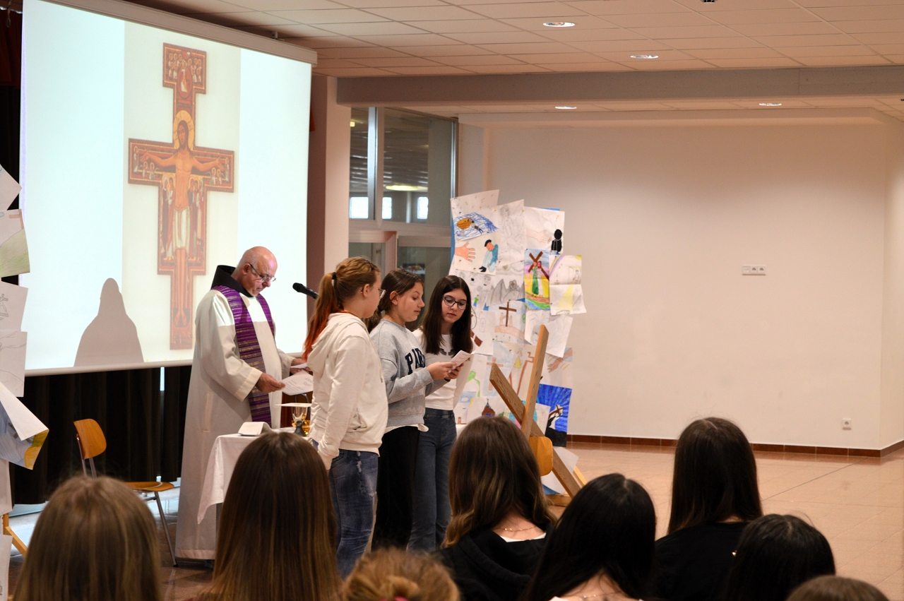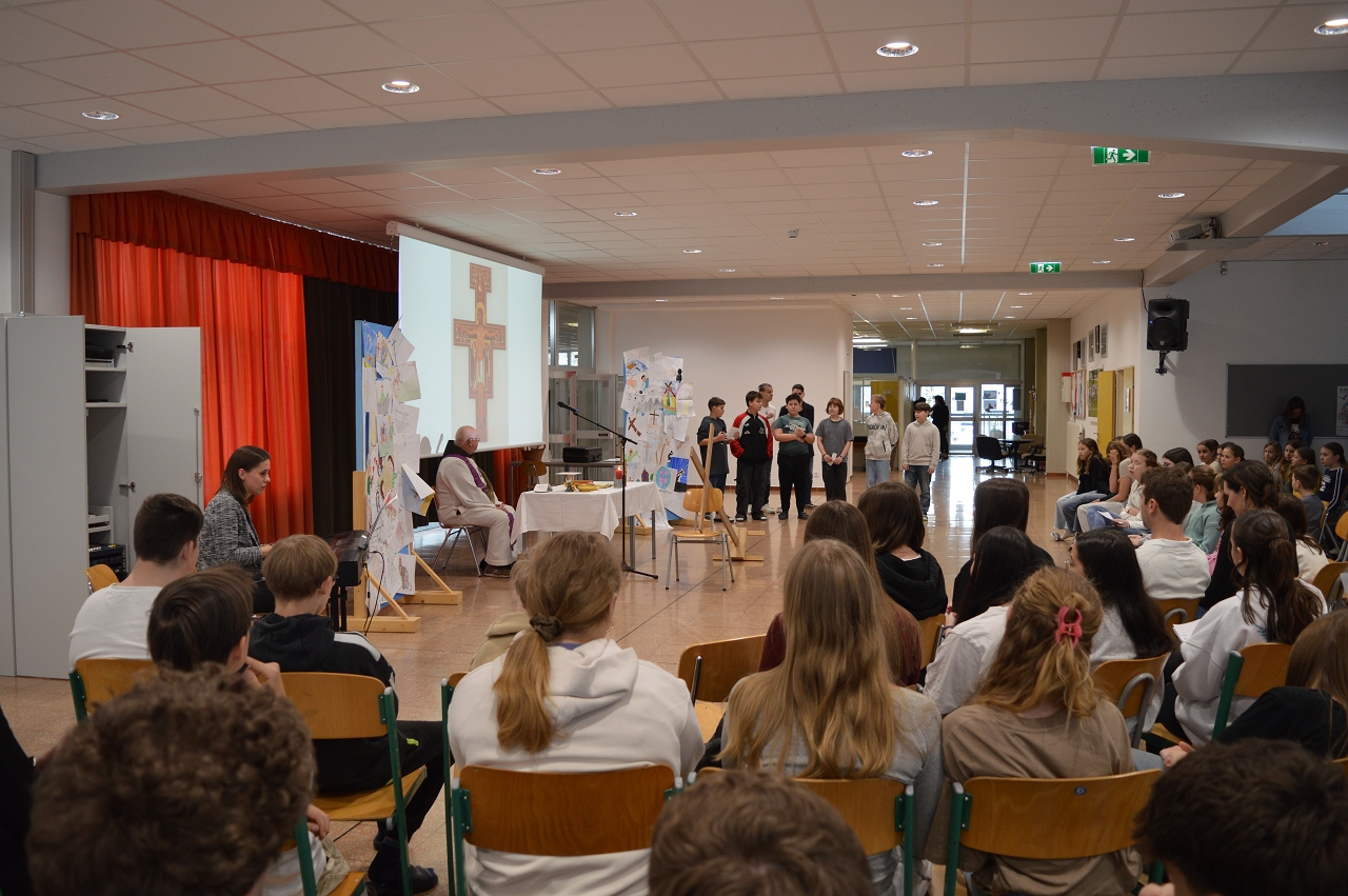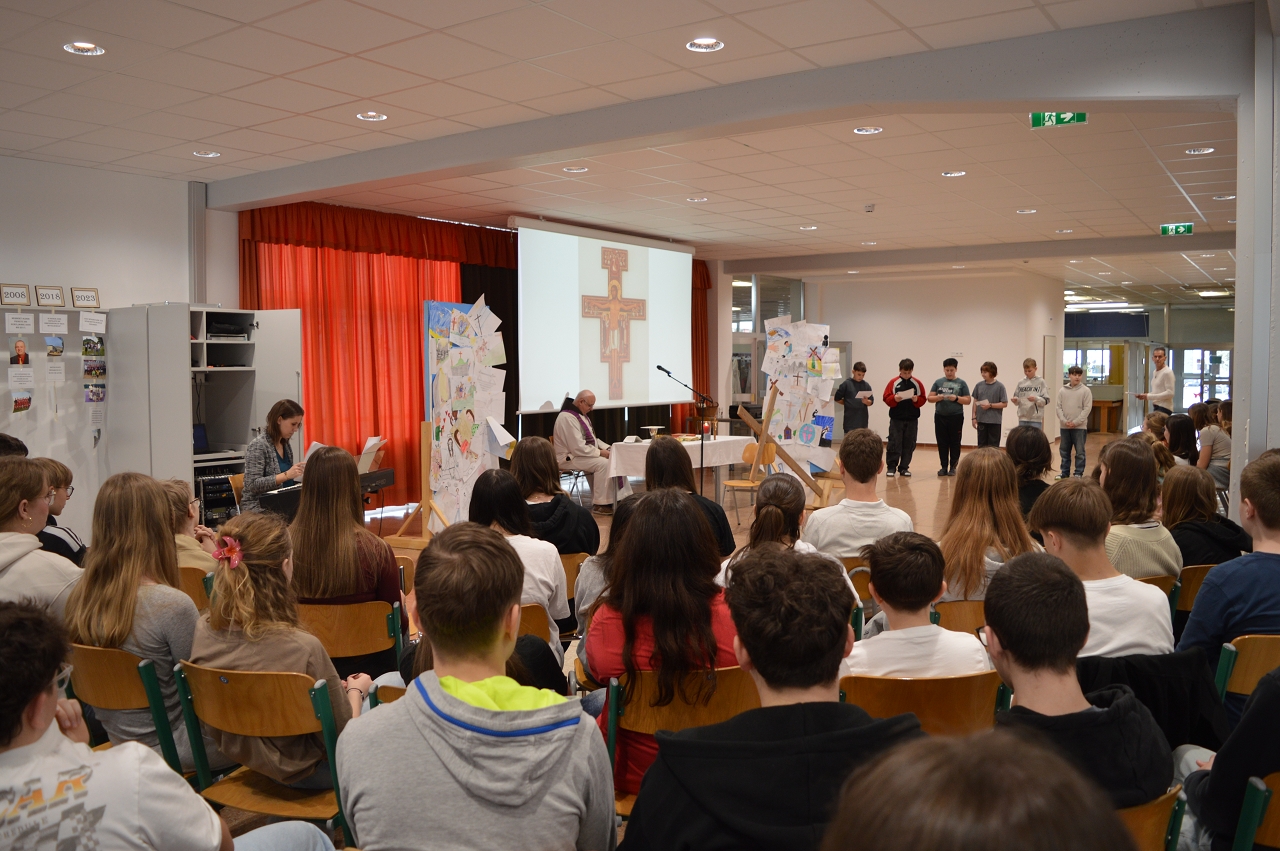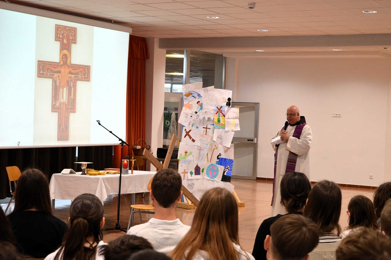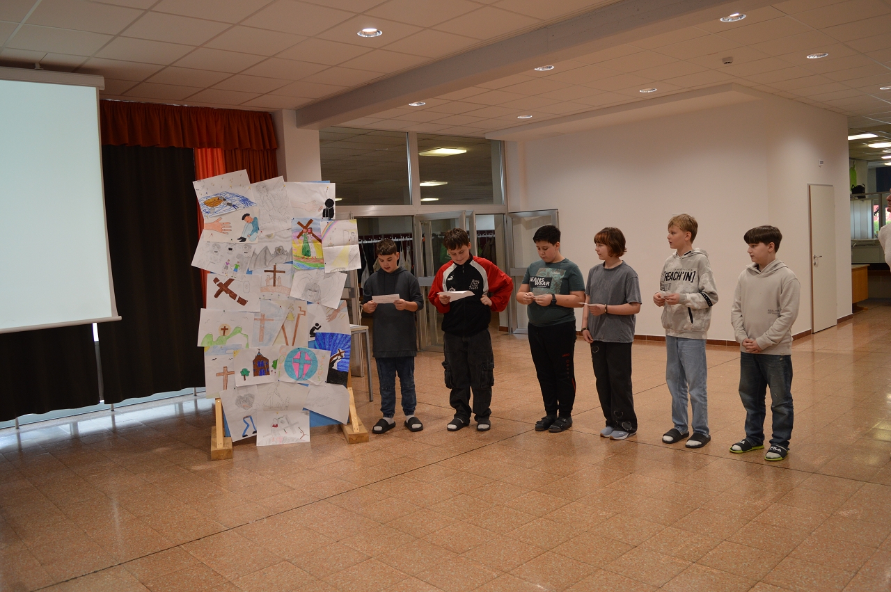 Zur Einstimmung auf das Osterfest feierten wir am 10. April 2025 einen gemeinsamen Gottesdienst in der Aula unserer Schule. Das Thema des Gottesdienstes lautete: „Das Kreuz tragen helfen“ - im Gedenken an den letzten Weg Jesu, aber auch als Aufruf, im Alltag auf die Sorgen und Ängste unserer Mitmenschen zu achten.