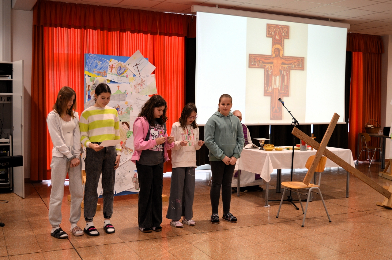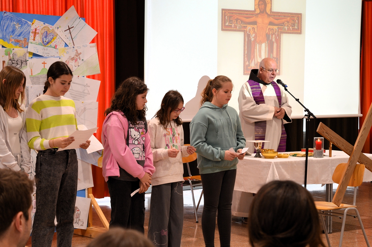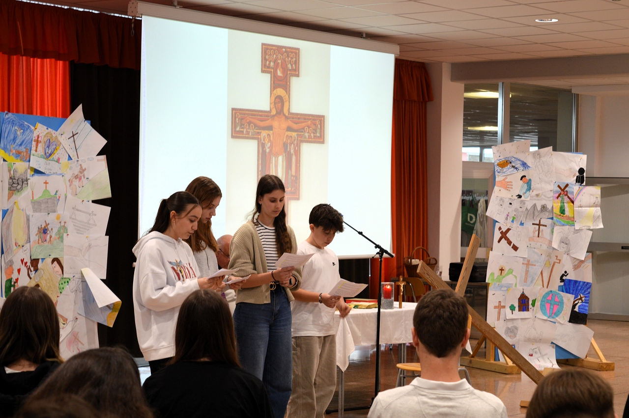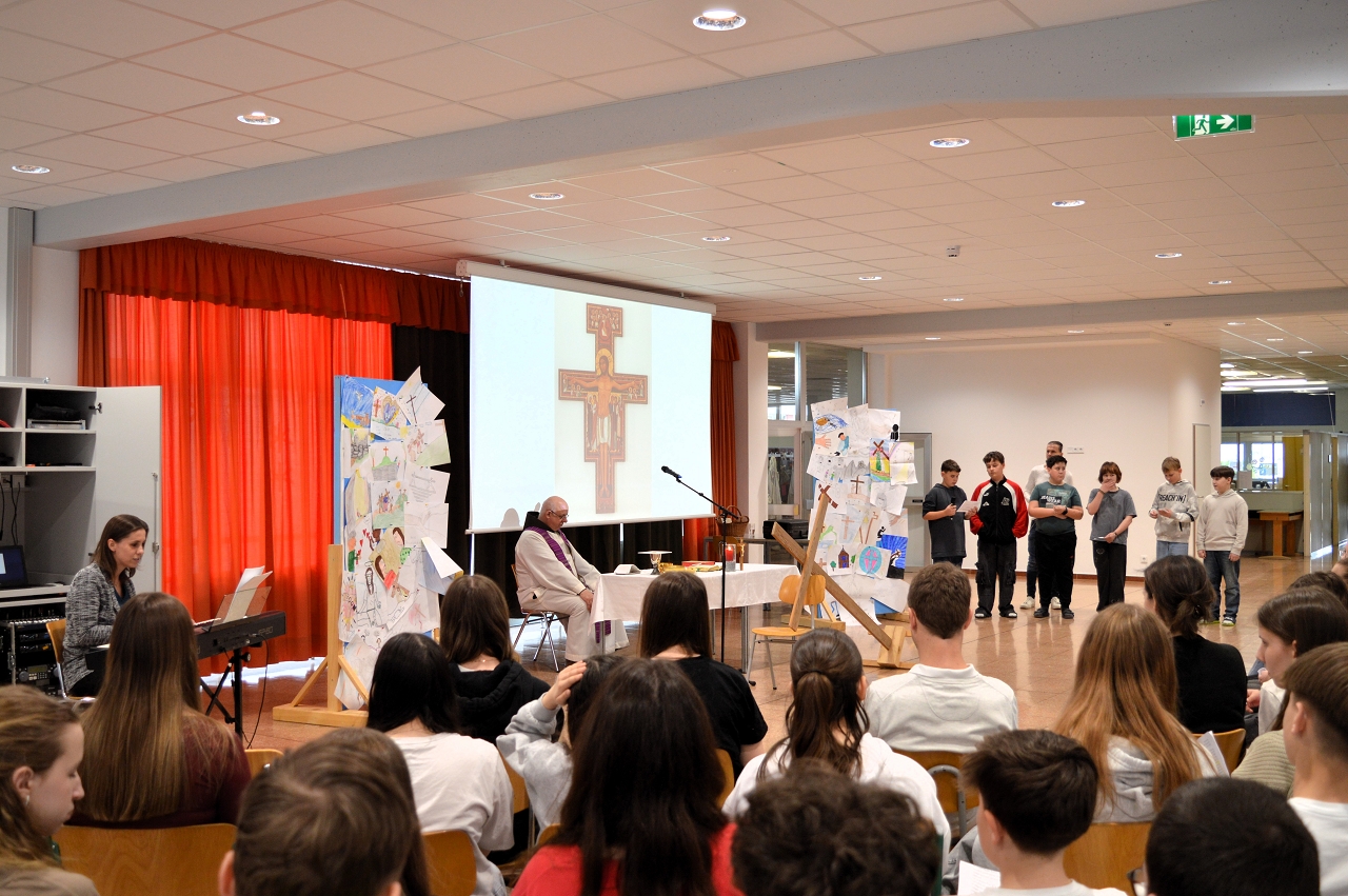 Zur Einstimmung auf das Osterfest feierten wir am 10. April 2025 einen gemeinsamen Gottesdienst in der Aula unserer Schule. Das Thema des Gottesdienstes lautete: „Das Kreuz tragen helfen“ - im Gedenken an den letzten Weg Jesu, aber auch als Aufruf, im Alltag auf die Sorgen und Ängste unserer Mitmenschen zu achten.
