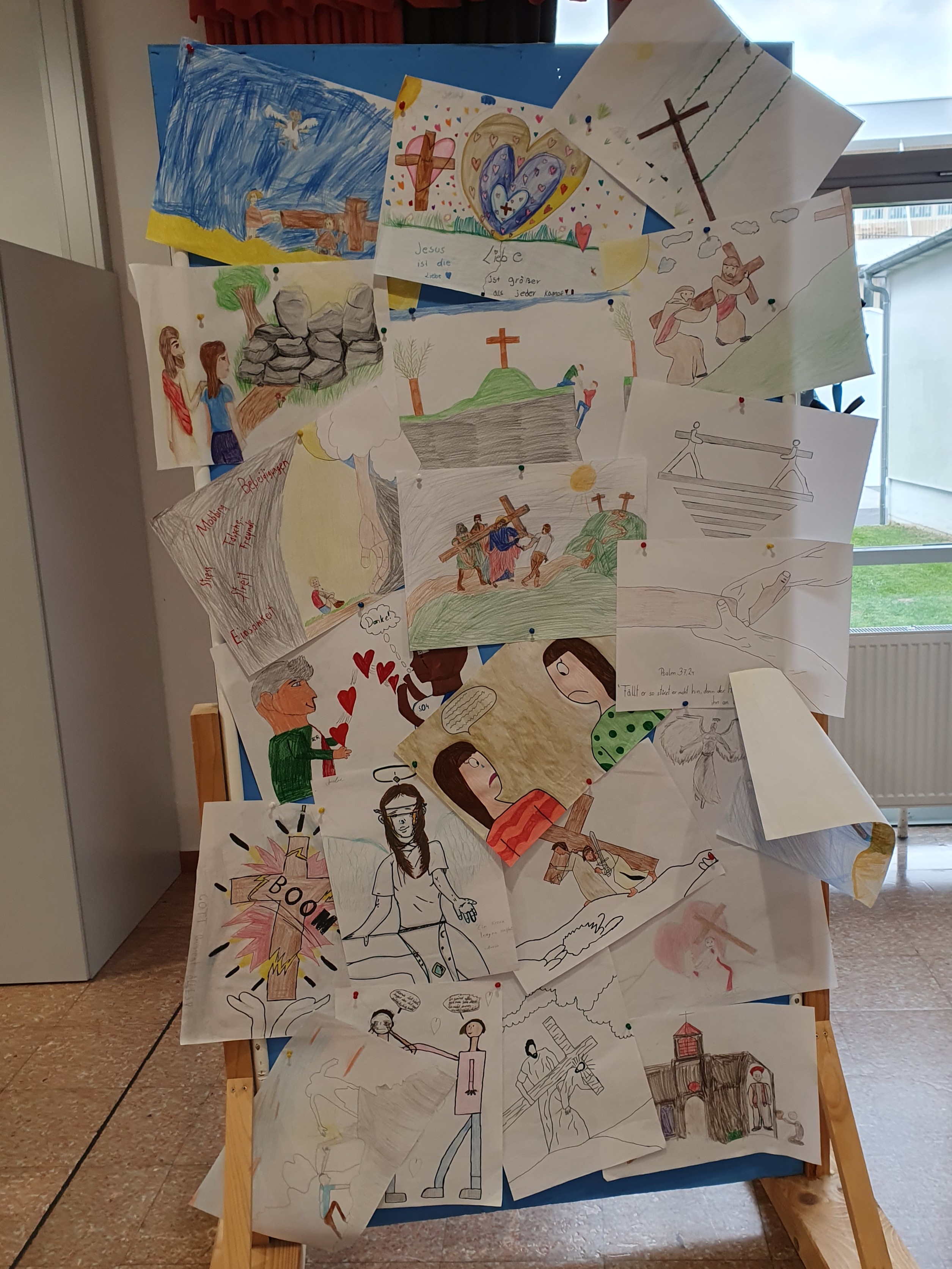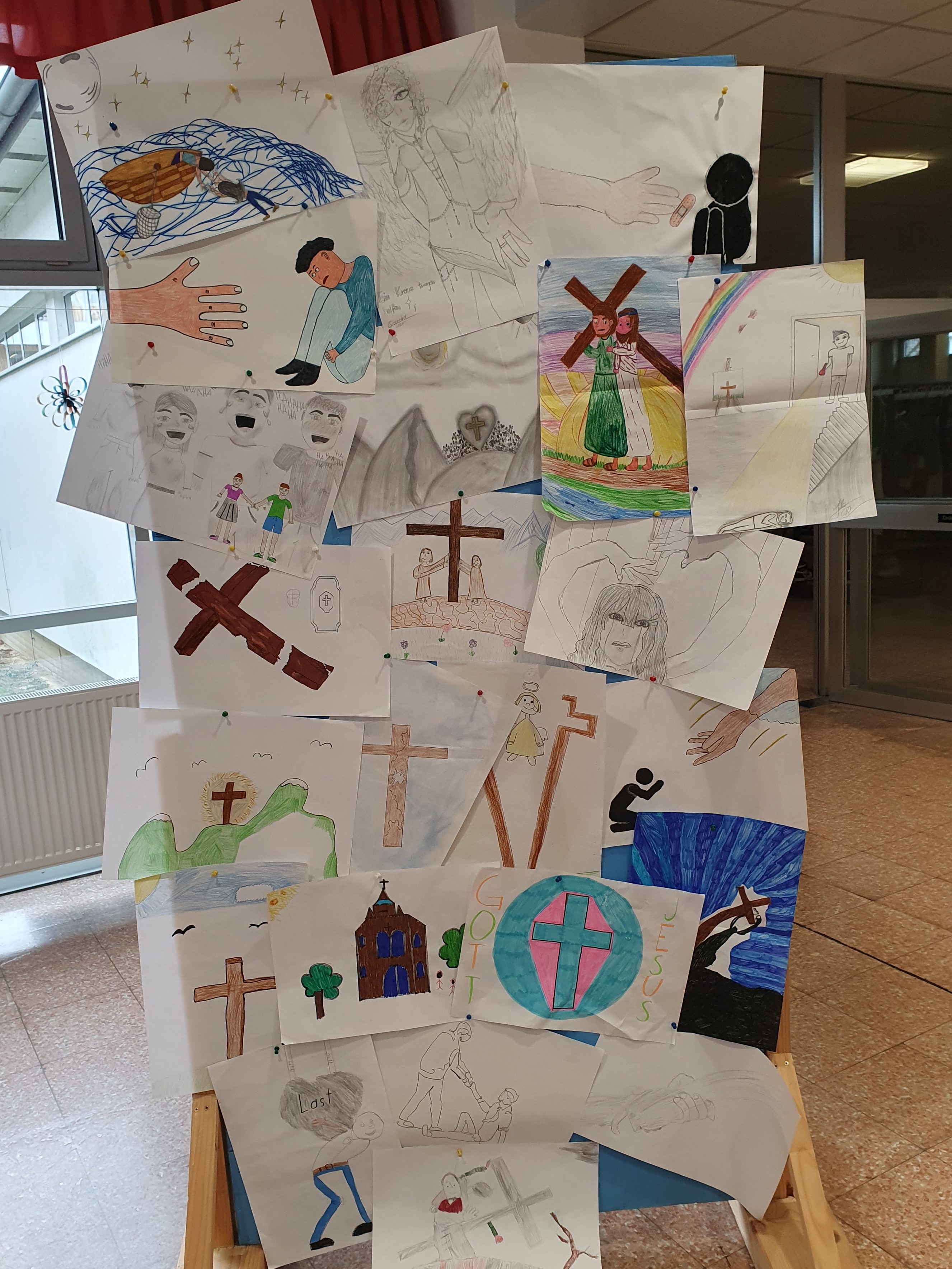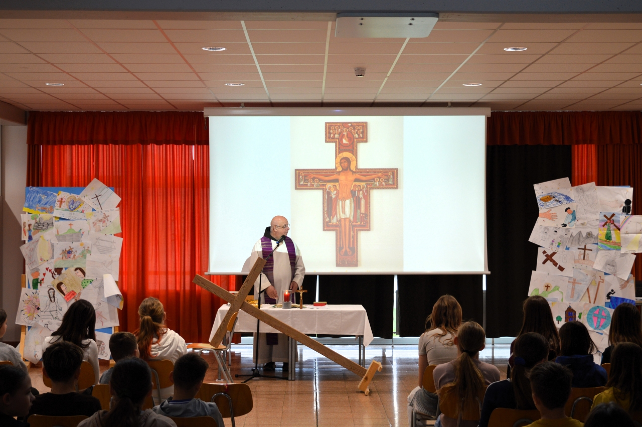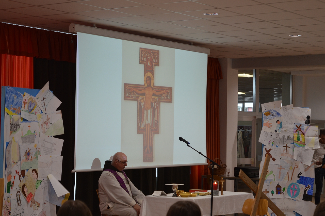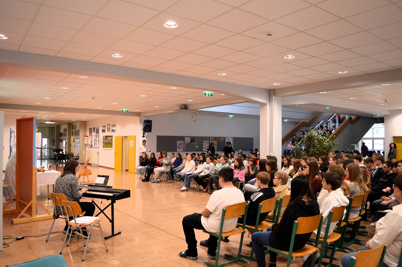 Zur Einstimmung auf das Osterfest feierten wir am 10. April 2025 einen gemeinsamen Gottesdienst in der Aula unserer Schule. Das Thema des Gottesdienstes lautete: „Das Kreuz tragen helfen“ - im Gedenken an den letzten Weg Jesu, aber auch als Aufruf, im Alltag auf die Sorgen und Ängste unserer Mitmenschen zu achten.